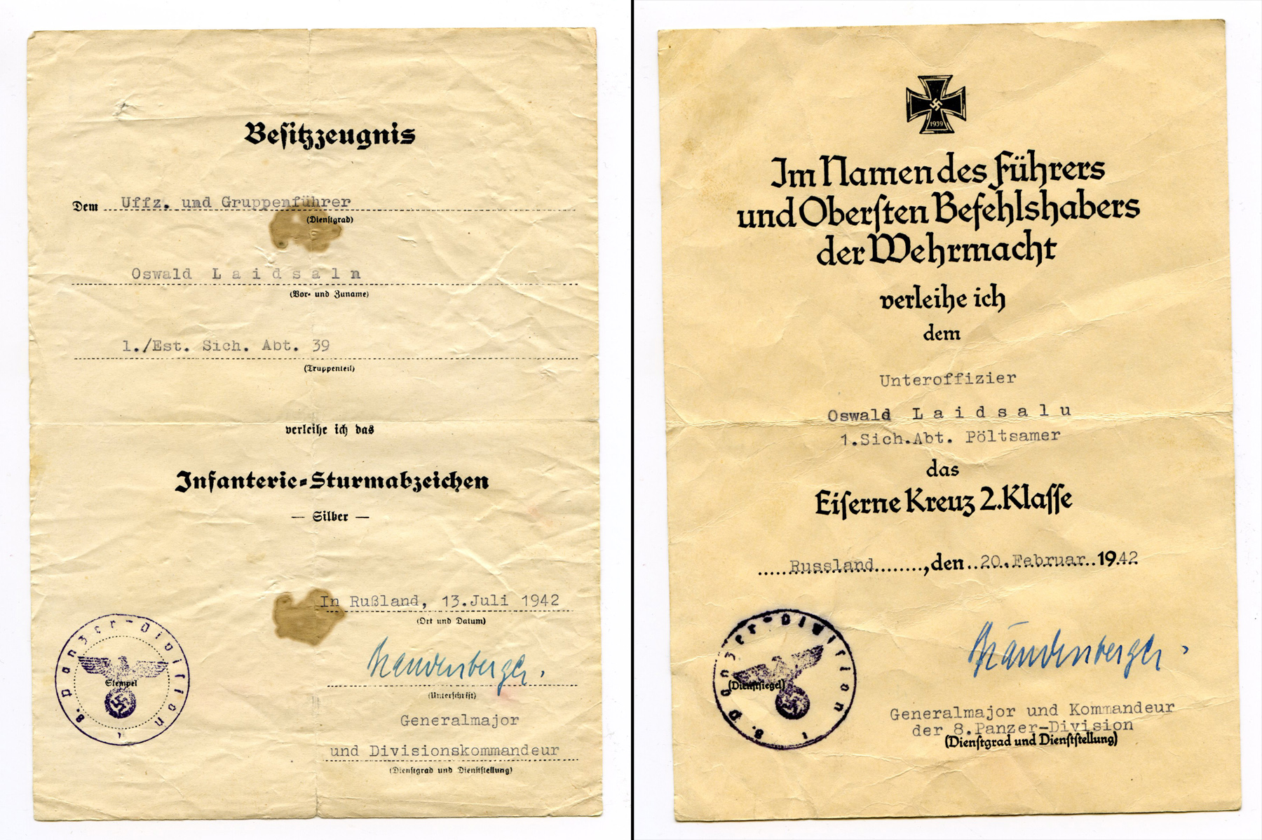 1. kompanii allohvitser Osvald Laidsalu võitles 8. tankidiviisi alluvuses Holmi välisrindel. Nende lahingute eest annetati talle 2. klassi Raudrist ja Hõbedane jalaväe rünnakumärk. Mõlemad dokumendid on allkirjastatud 8. tankidiviisi ülema kindralmajor Erich Brandenberger'i poolt, kes teenis sõjaajal välja Raudristi Rüütliristi koos Tammelehtedega.