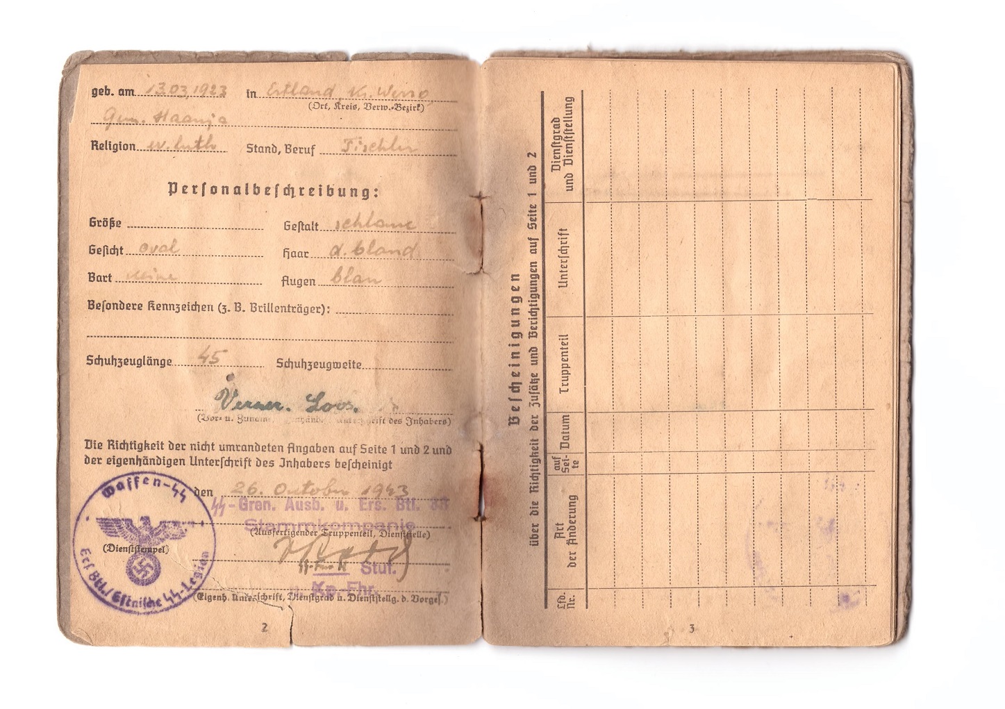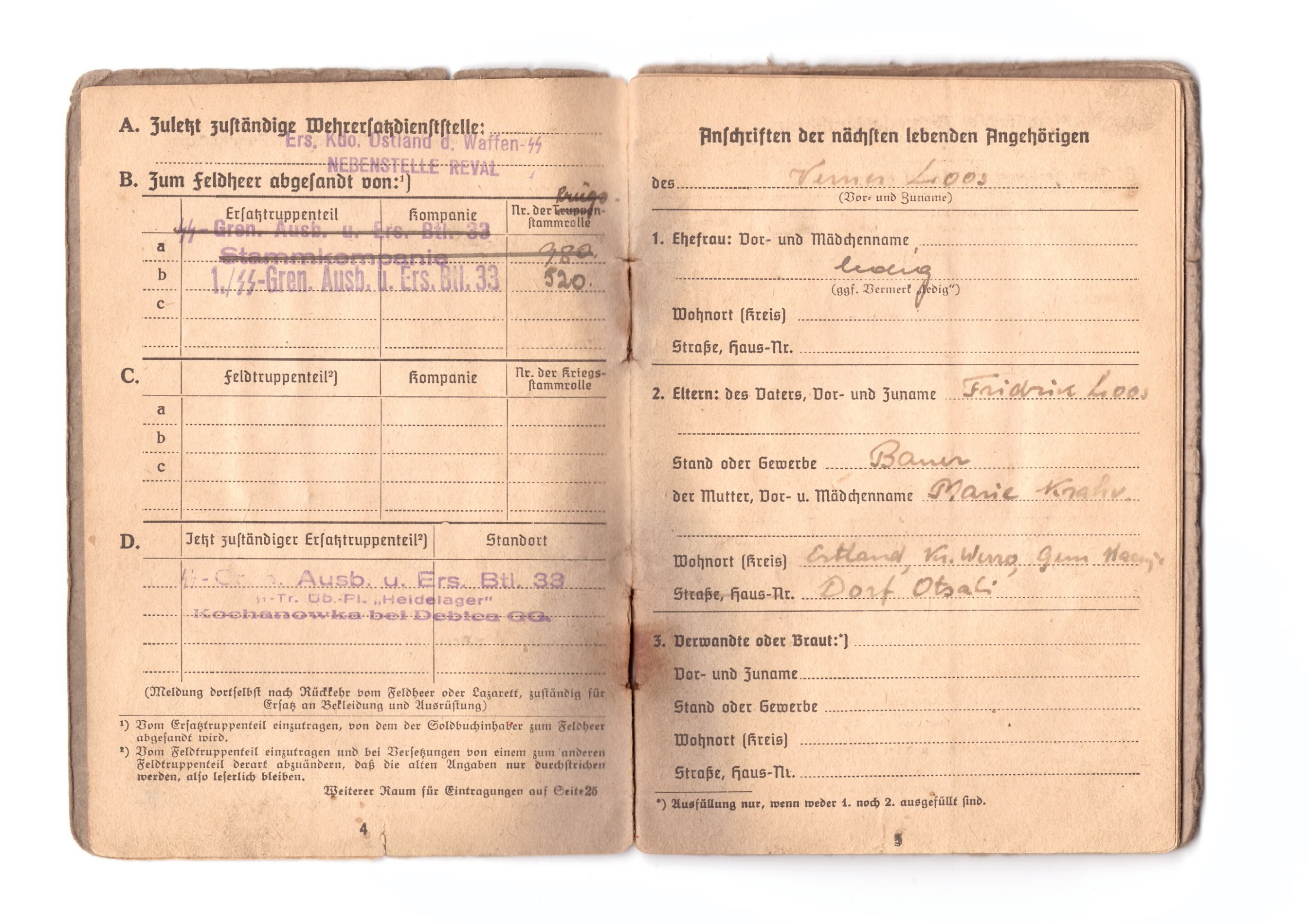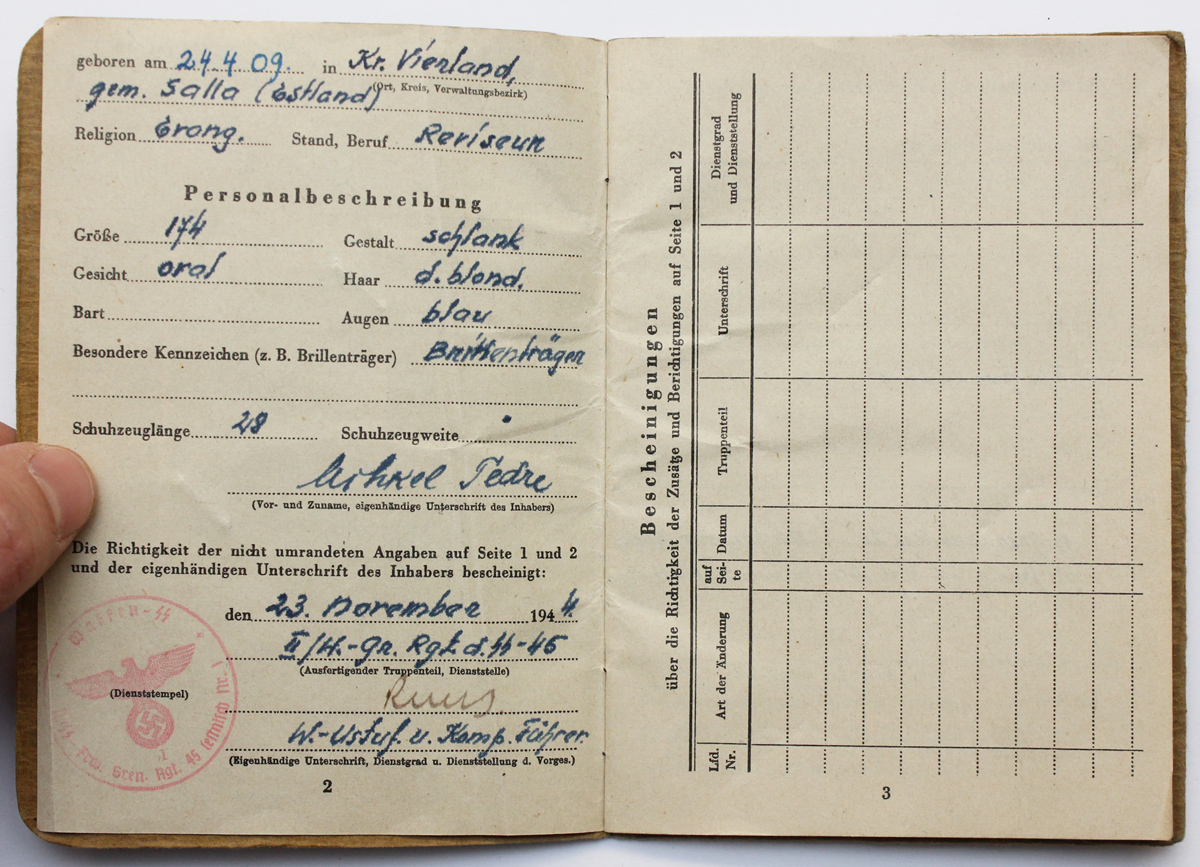 SS-Frw.Grenadier Verner Loos´ile kuulunud Soldbuch. Vähestest märgetest huvitavaim on sissekanne granaadi(mürsu) killust haavata saamise kohta.