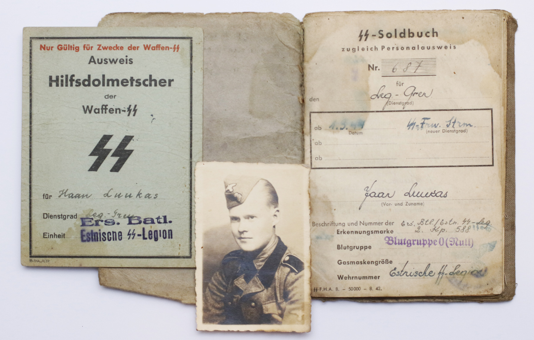 Minu eilne leid - 46. Eesti SS rügemendi 15. (pioneer) kompanii Sturmmann Jaan Luukas'e Soldbuch, foto ja SS abitõlkija tunnistus. SB on välja kirjutatud 1943. aasta aprillis Debicas, mai teises pooles saadeti ta Oranienburgis asuvasse SS tõlkijate kooli (W-SS Dolmetscherschule). Arhiivimaterjalidest leidsin, et kokku saadeti 1943. aasta mais sinna kolm gruppi eestlasi - 20. mai läks teele kaks gruppi (18 + 14 meest) ja järgmisel päeval "ülejäänud mehed". Kahjuks ei ole täpsustatud palju neid ülejäänud mehi oli aga eks samuti midagi sinna 10 ja 20 vahele.
