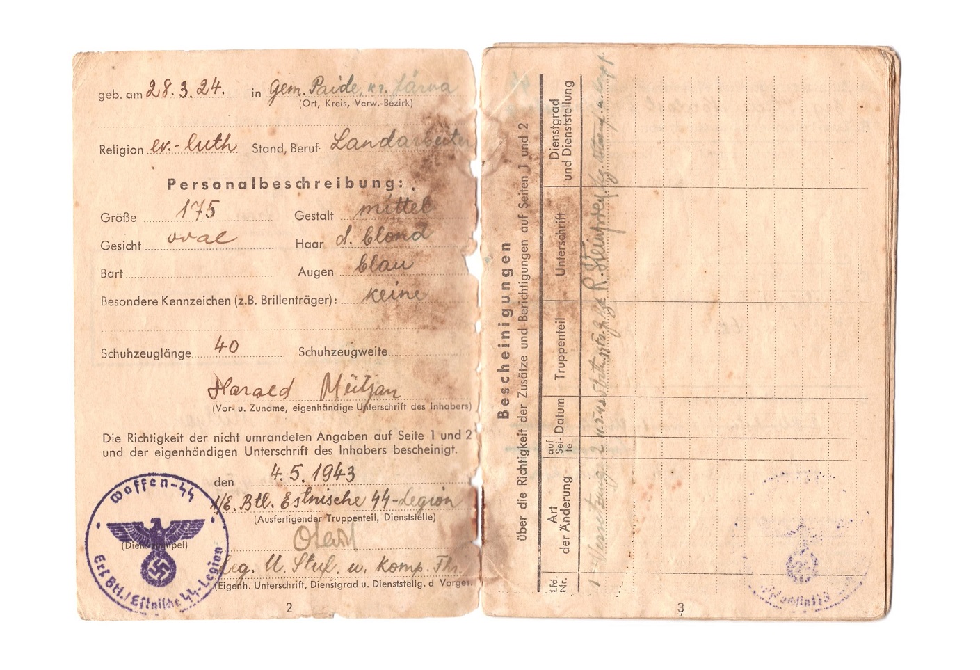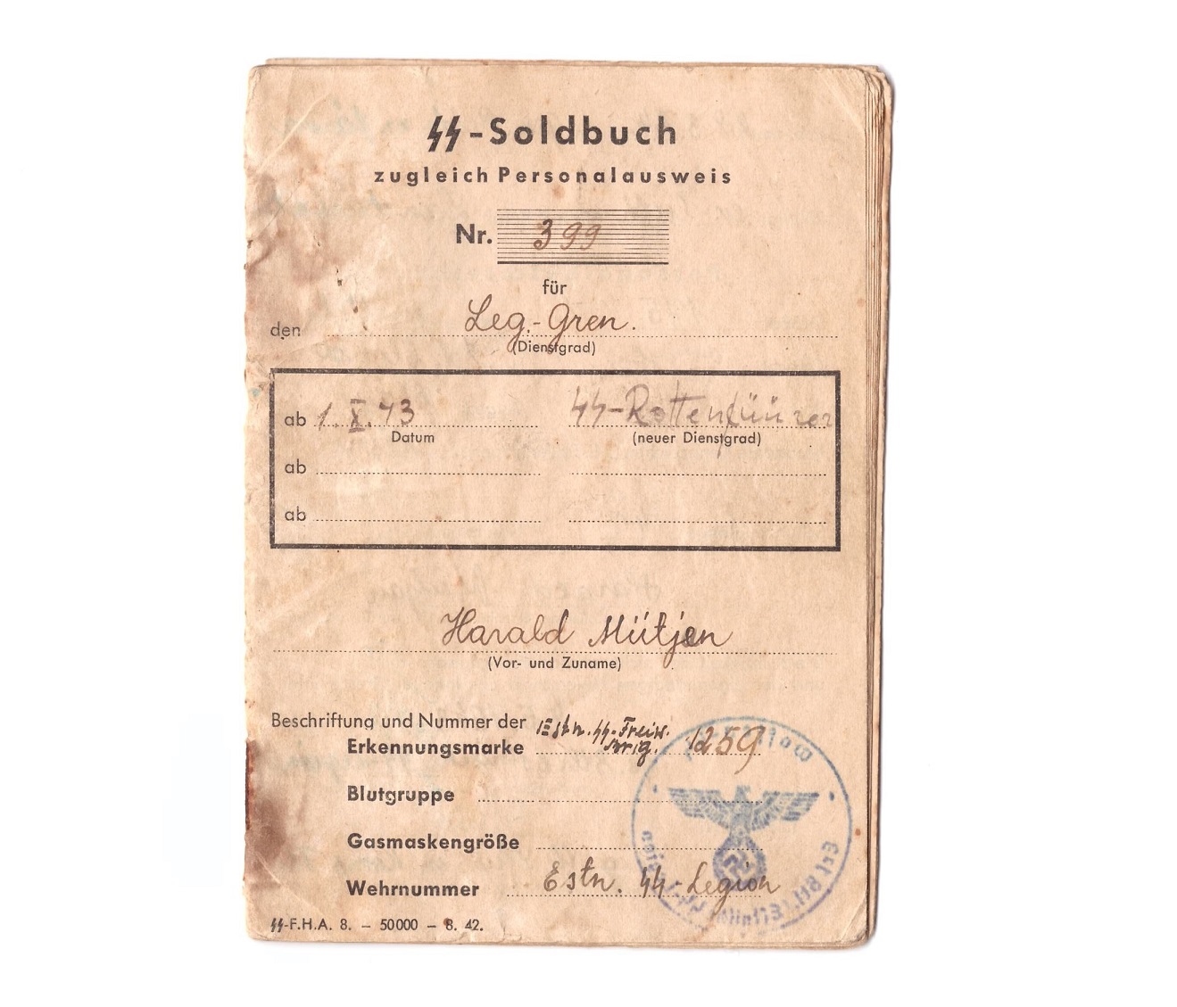 SS-Rottenführer või siis maakeeli SS-Rottenfüürer Harald Miitjan´i Soldbuch. Samuti mehe nimega segadust palju. Mitmes kohas on Miitjen parandatud Miitjaniks. Juhuse kokkulangemisena on just täna sobiv siia see postitada, sest täpselt nüüd 95 aastat tagasi oli H.Miitjani sünnidaatum.