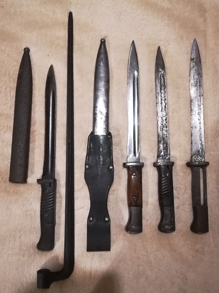Vasakult alates: 1) Teritatud, nupu pea ning pealmine sälk maha käiatud, tupe roostes, bakeliidid ilusad 2) Muidu oleks ilus berdan, aga kinnitus on haihtunud 3) nahal puudu kinnitusrihm, tupe läikivaks hõõrutud nagu ka tera, põsed puust ja tunduvad originaalid, teritatud, numbrid klapivad 4) Teritatud, ilmselt vett ja külma saanud, bakeliit on kõveraks paisunud 5) rõvedalt teritatud, nupp kinni