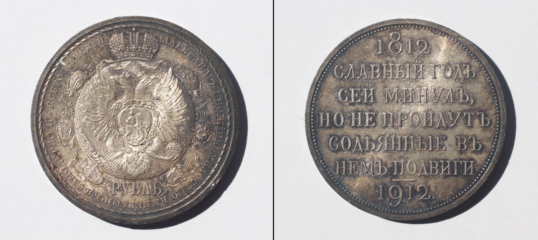 Pildil on sõja 100. aastapäevale pühendatud, 1912. aastal vermitud 1-rublane münt.