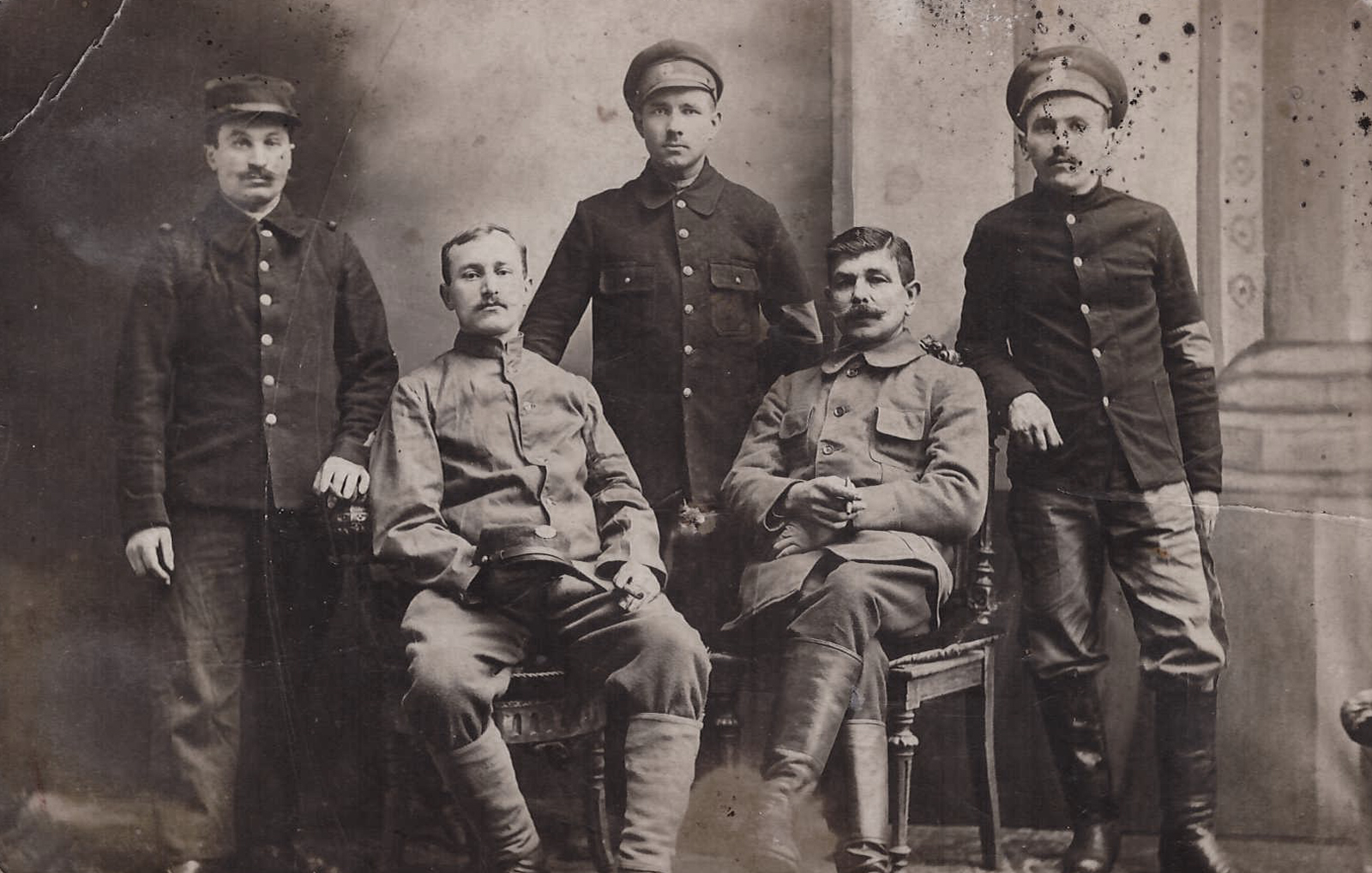 Teisel pildidl võiks olla kaks prantslast (mütsidega), samas teine istuv ja suitsetav ohvitser võiks olla inglane. Keskmine seisev mees on sama kes viimasel pildil. Mütsil venelaste kokard. Seljas brittide frenš. Kolmas seisev mees on ka venelane (eestlane?), mütsil venelaste kokard ja veel midagi.