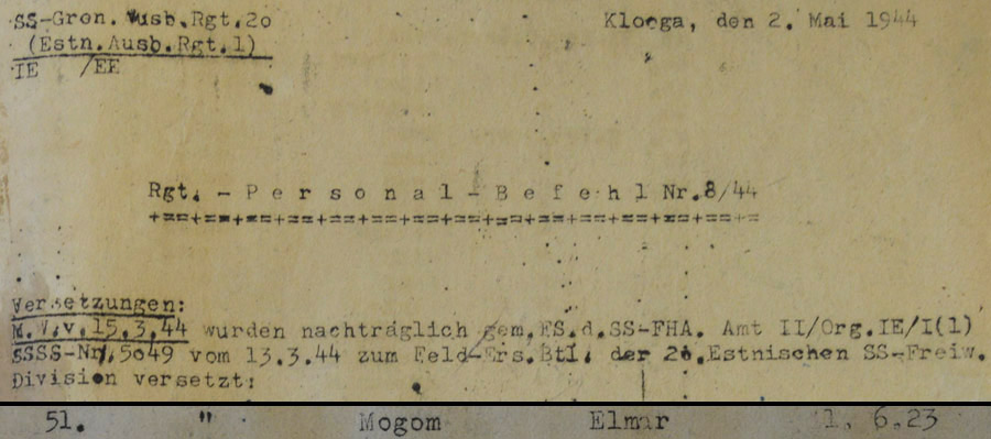 Dokument, kus on märge Idapataljonide 658 ja 659 ja Idakompanii 657 üleviimise kohta 20. ED koosseisu - see ED koosseisu tähendab siin Kehra ümbruses asuvat 20. SS Välitäienduspataljoni. Eelpoolnimetatud üksuste haiglaravil viibivad, väejooksikud ja muidu "mittekõlblikud" suunatakse 20. SS Tagavarapataljoni.