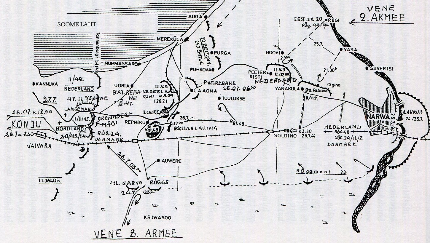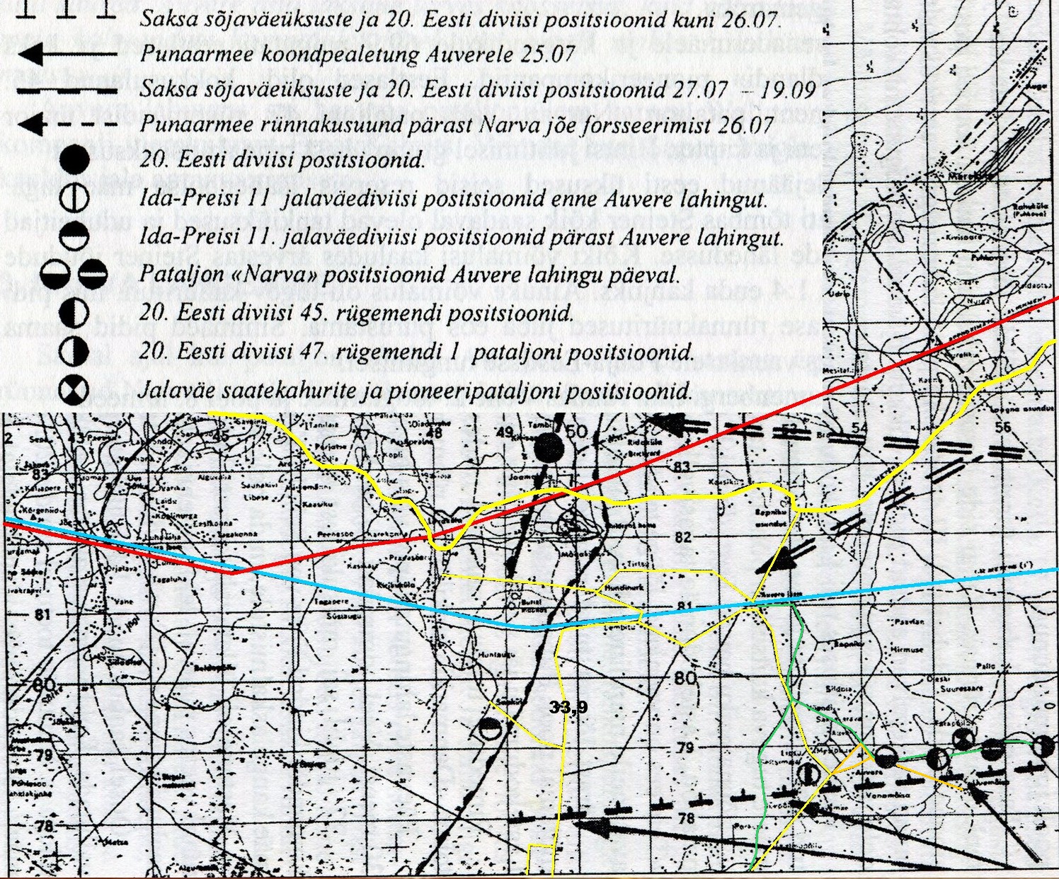 Äraandjad. Ühest esimese pataljoni komandopunkti juures allalastud lennukist leiti lenduri juurest kaart, millele oli sinise värviga trükitud kogu Narva rinde positsioonide seis sellisena kui see oli juunikuu lõpu poole. Kaardi äärel oli Sõjakomissariaadi kartograafia osakonna märkus, et pealetrükk on tehtud 17. juulil. Seega kaheksa päeva enne pealetungi algust. Teine samasugune kaart saadi Auvere jaama juurde langenud lennukist ja kolmas seisma tulistatud tankist, polkovniku tunnuseid kand¬va ohvitseri kaarditaskust.