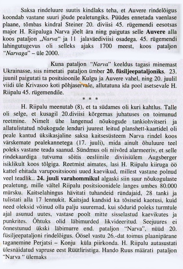 Mäletan, et sel ööl ma uinuda ei saanud - olukord oli liiga ärev. Mõtlesin meie kompanii poistele: “Kas nad suudavad vastu pidada?” Vastase poolel oli suur ülekaal nii elavjõu kui ka tankide osas. Kui major Riipalule alluvates üksustes oli umbes 2000, kõige rohkem 2500 meest, siis vastane võis meid rünnata mitme diviisiga. Oli ju Punaarmee rünnaku eesmärgiks Auvere juures rindest läbi murda, jõuda mereni Mummasaares ja armeegrupp “Narva” kotti võtta.