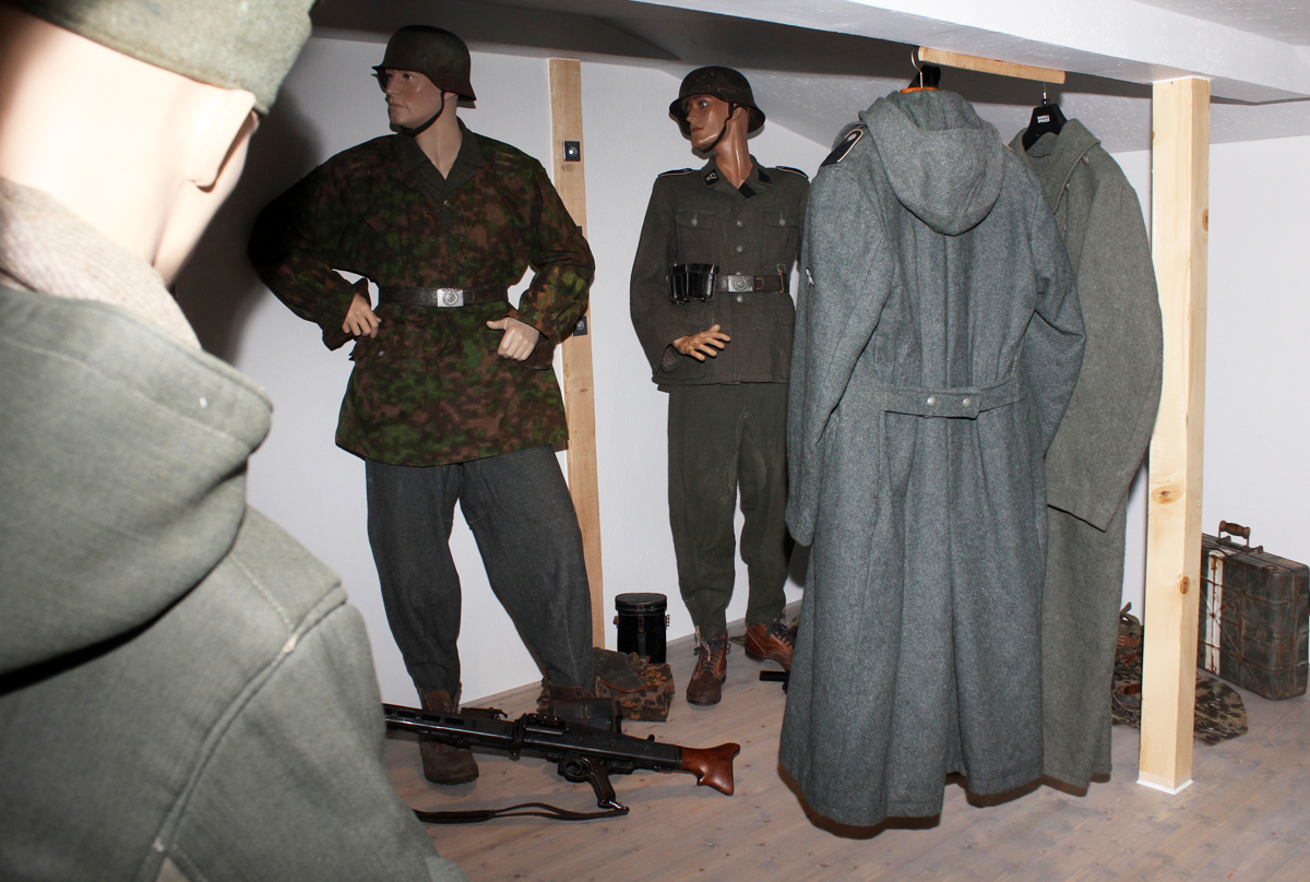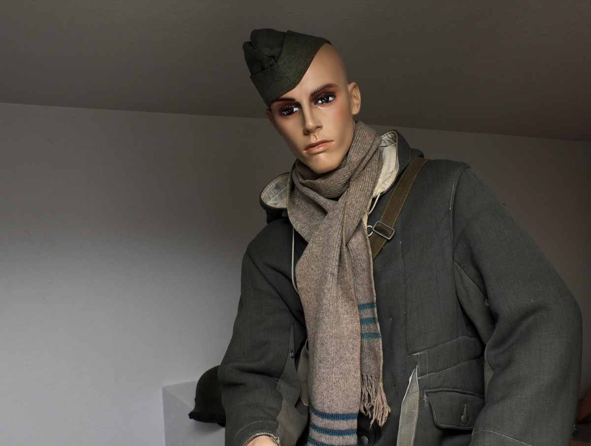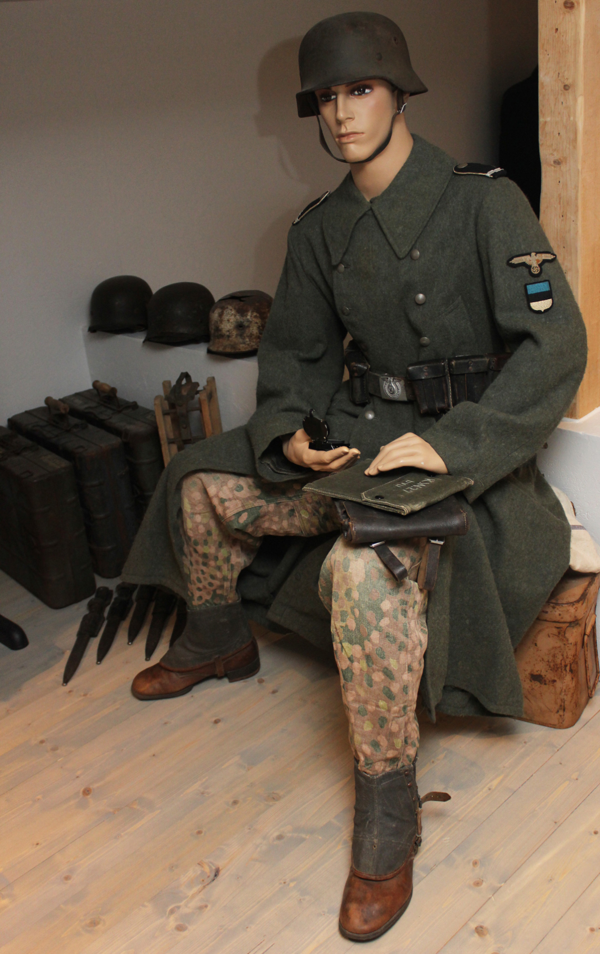 Tänase päeva ettevõtmine oli kolme ED sõduri riietamine. Laiguline Rauchtarnmuster maskeerimisjakk on leitud 90-ndate aastate alguses Raplamaalt - algne omanik on kahjuks teadmata, kiiver on pööninguleid Kergu lähedalt. Välihall vormikomplekt on Grenadier Leo Saare oma, kellest tegin 1,5 aastat tagasi omaette teema. L. Saare kuulus ED 47. rügemendi I pataljoni koosseisu ja tegi läbi Sinimägede lahingud. Peale venna langemist 30.07.1944 tuli koju ja deserteerus sõjaväest. Välihalli sõduri vöörihm on Pärnumaalt pärit Kare nimelisele mehe oma ja pandla omanik oli Grenadier Egon Saa. Kiiver on kuulunud ilmselt 29.07.1944 Sinimägedes langenud Michael Pelgeri nimelisele sakslasele. Pagunite ja kotkaga mantli omanik oli Albert Aavik, kelle kohta õde oskas ainult öelda, et vend oli Pitka löögiüksuses. Kahjuks ei ole arhiivinimekirjadest õnnestunud leida andmeid tema varasema teenistuskoha ja -käigu kohta. Halli parka ja pükstega komplektis on algne omanik teada ainult välimütsi ja see kuulus Häädemeeste kandist pärit Villi Grant'ile (arhiivinimekirjades Krant). Kaela seotud sall on arvatavasti hoopis ennesõjaaegne Punaarmee jagu.