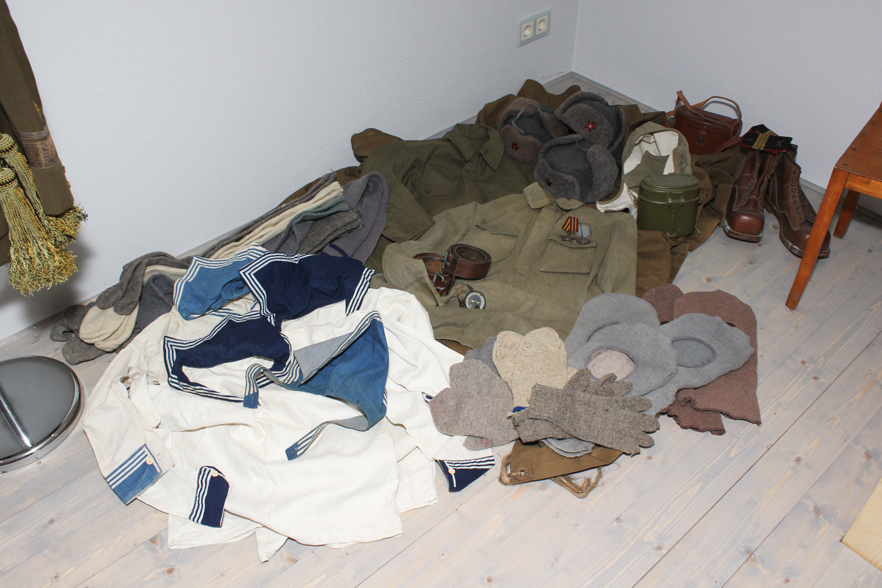 Riidevarustus on kõik ennesõjaaegne ja pärit Paldiski ladudest, kuhu see jäi sõja alguses maha. Tublid talumehed kogusid selle siis oma aitadesse - enamik pildil olevatest riideesemetest ongi pärit tegelikult ühest Vihterpalu piirkonna aidast. Kõik peale ühe madrusepluusi ja medalitega vormipluusi on laokonditsioonis ja kandmata. Medalid lisasin ise (numbrivahemike järgi otsustades 8. ELK komplekt, mõlemad autasud kuulunud ühele mehele).
