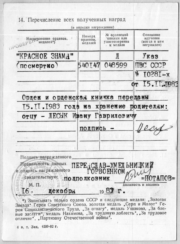 Jagati küll Afganistani sõjas. Üsna väikeses koguses. Raske on öelda, mille eest see konkreetne on antud, vôib olla mis iganes, sest hilisemate Punalipu ordenite juures see suurem/ väiksem number loogika eriti ei kehti. Mul endal oli vist 560 ***, mis oli antud viiekymnendate lôpus rasketes meteooludes lendamise eest ja samas on 530*** mis oli antud kuuekymnendatel KGBeshnikule...
