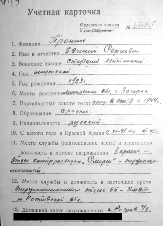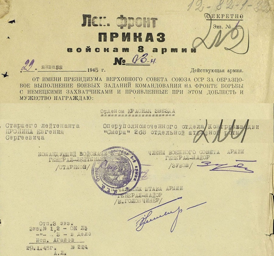 8. Armee 268. üksiku trahviroodu vastuluure osakonna SMERSH vanemleitnant Pronin