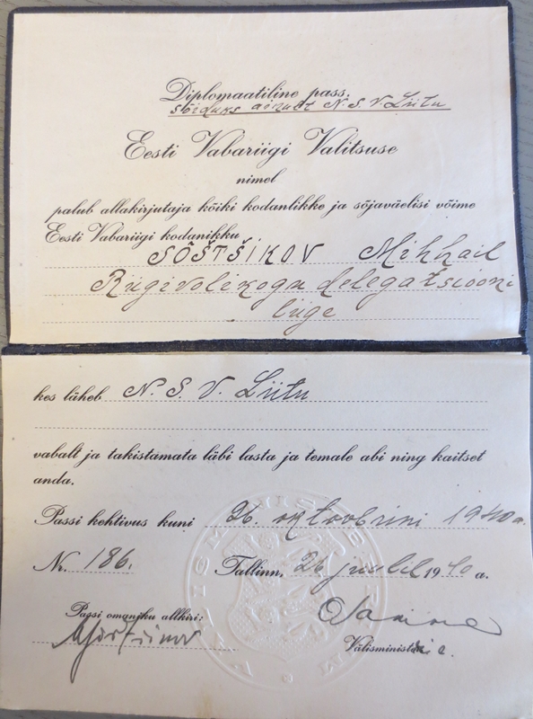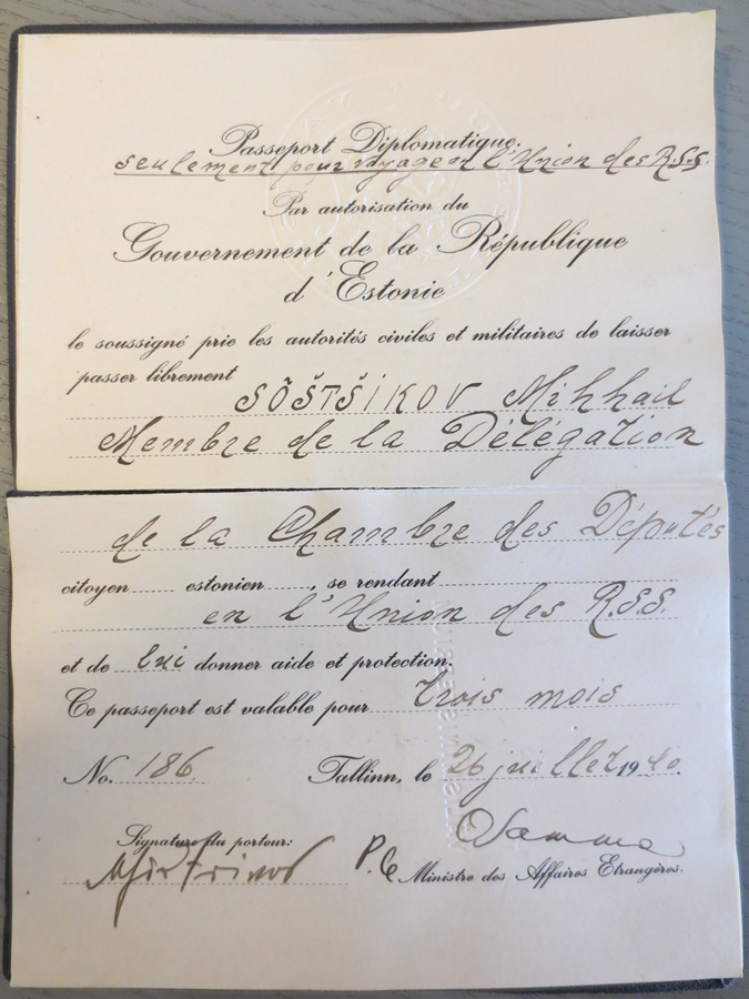 Piltidel on delegatsiooni liikme Mihhail Sõstšikovi diplomaatiline pass sõiduks NSV Liitu. Mihhail Sõstšikov oli Riigivolikogu II koosseisu (hilisem ENSV Ülemnõukogu I koosseis) liige, valitud Riigivolikokku 29. valimisringkonnast mis asus Petserimaal. Arvestades, et delegatsioonis oli kokku vaid 21 liiget, on tegemist väga haruldase esemega. Rääkimata selle diplomaatilise passi ajaloolisest väärtusest.