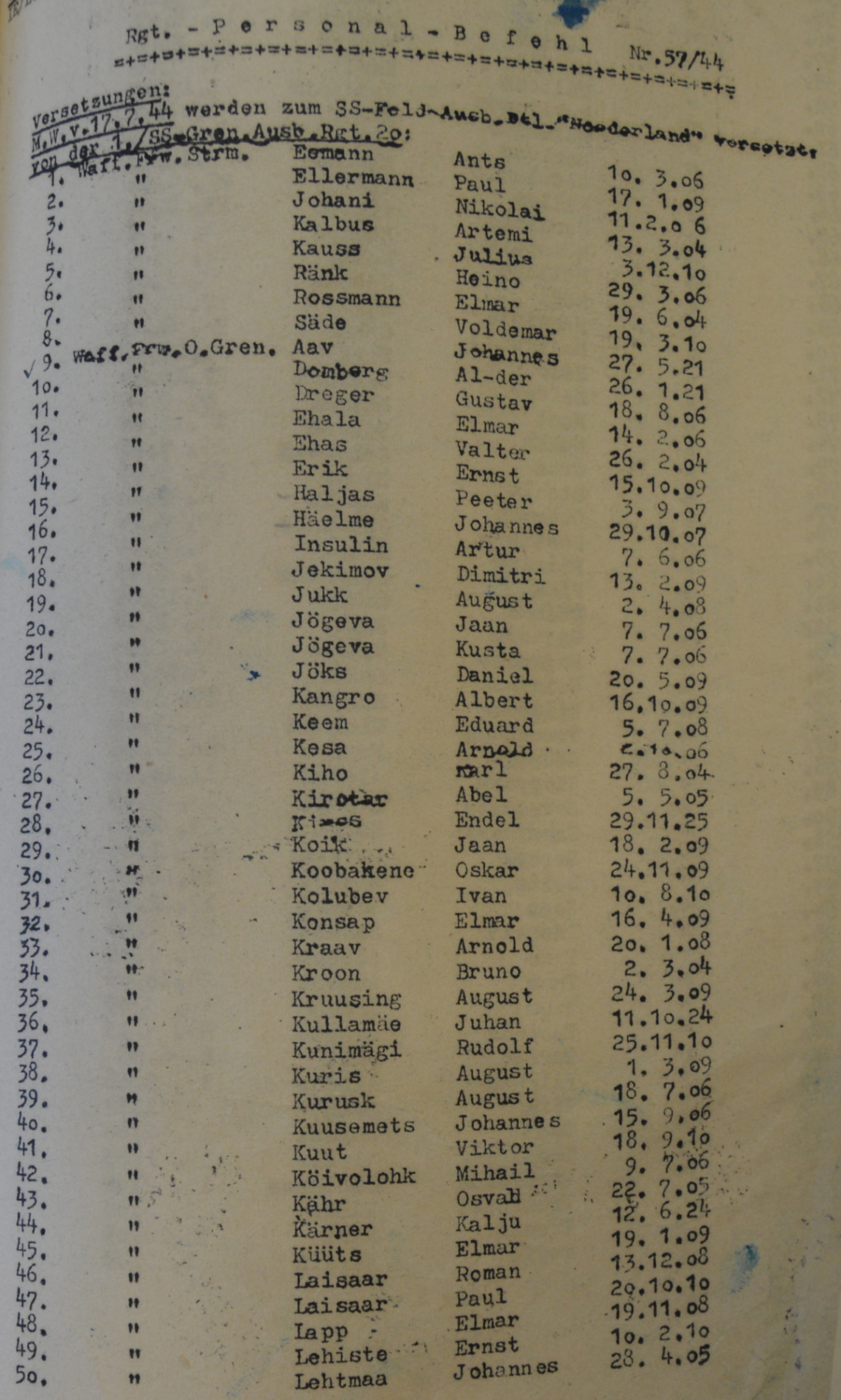 Täpselt 400 eestlast on saadetud Kloogal paiknevast 20. väljaõpperügemendist 1944. aasta juulis brigaadi "Nederland" väli-väljaõppepataljoni koosseisu.