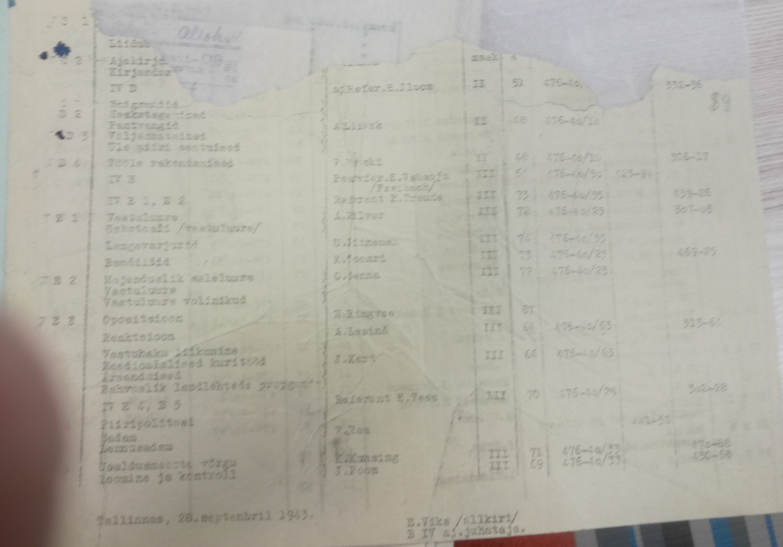 Täiendust arhiivist. Selline dokument 1943nda aasta septembrist Tallinnast. Selgub, et ta oli Eesti Julgeolekupolitsei B IV osakonna 3nda alamosakonna pealik, mille nimeks on lakooniliselt "Juudid". Wikipedias seisva Julgeolekupolitsei struktuuri järgi aga on asi täiesti segane. Kas keegi oskab selgitada, et millega tema osakond siis kokkuvõttes tegeles ning kas selle alamosakonna kohta ka mingit lähemat infot arhiivis leiduks. Lisaks sellele, kas dokumentides seisvad numbrid tähistavad alluvses olnud inimeste arvu? Mida rooma numbrid võiksid tähstada?