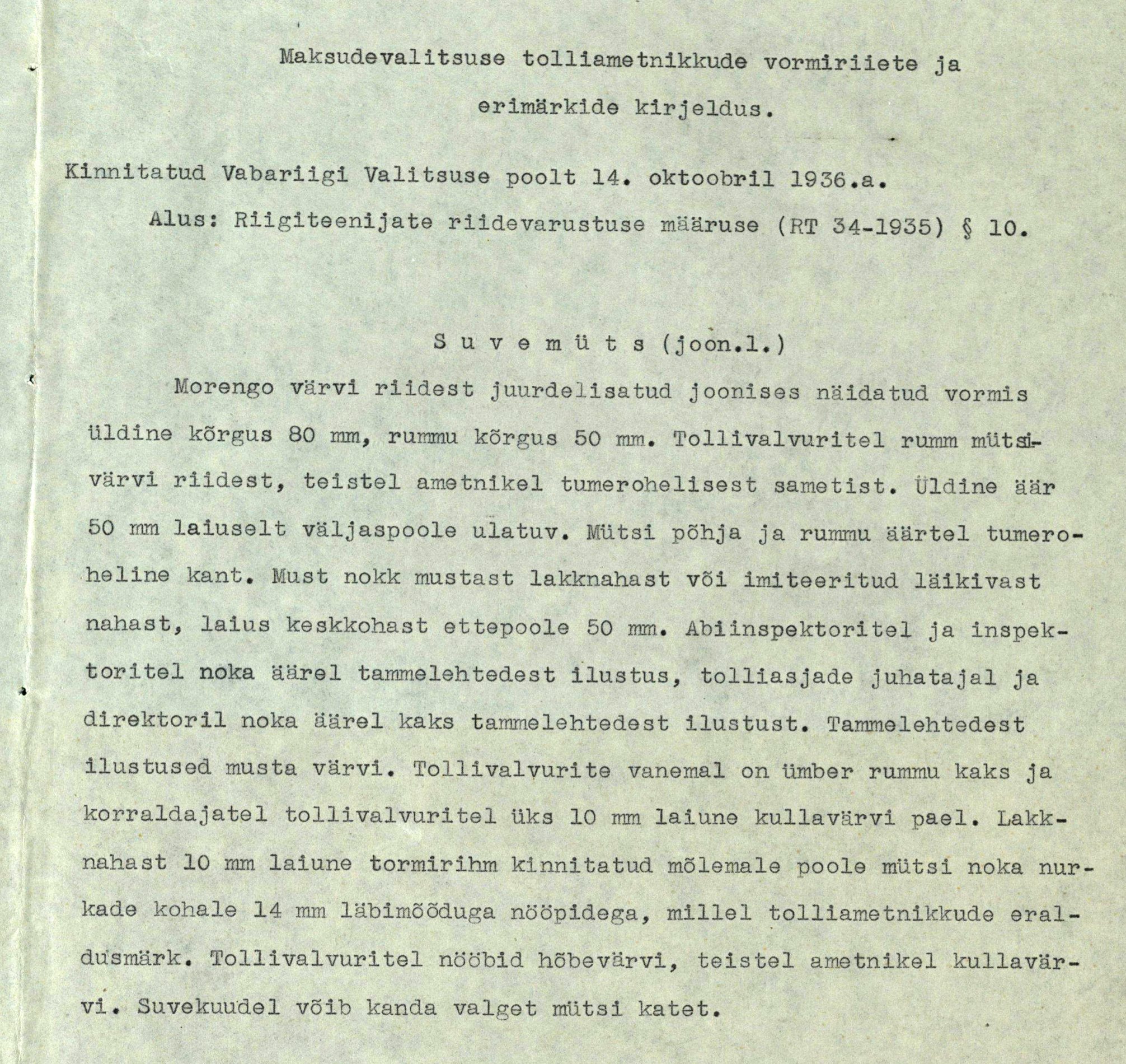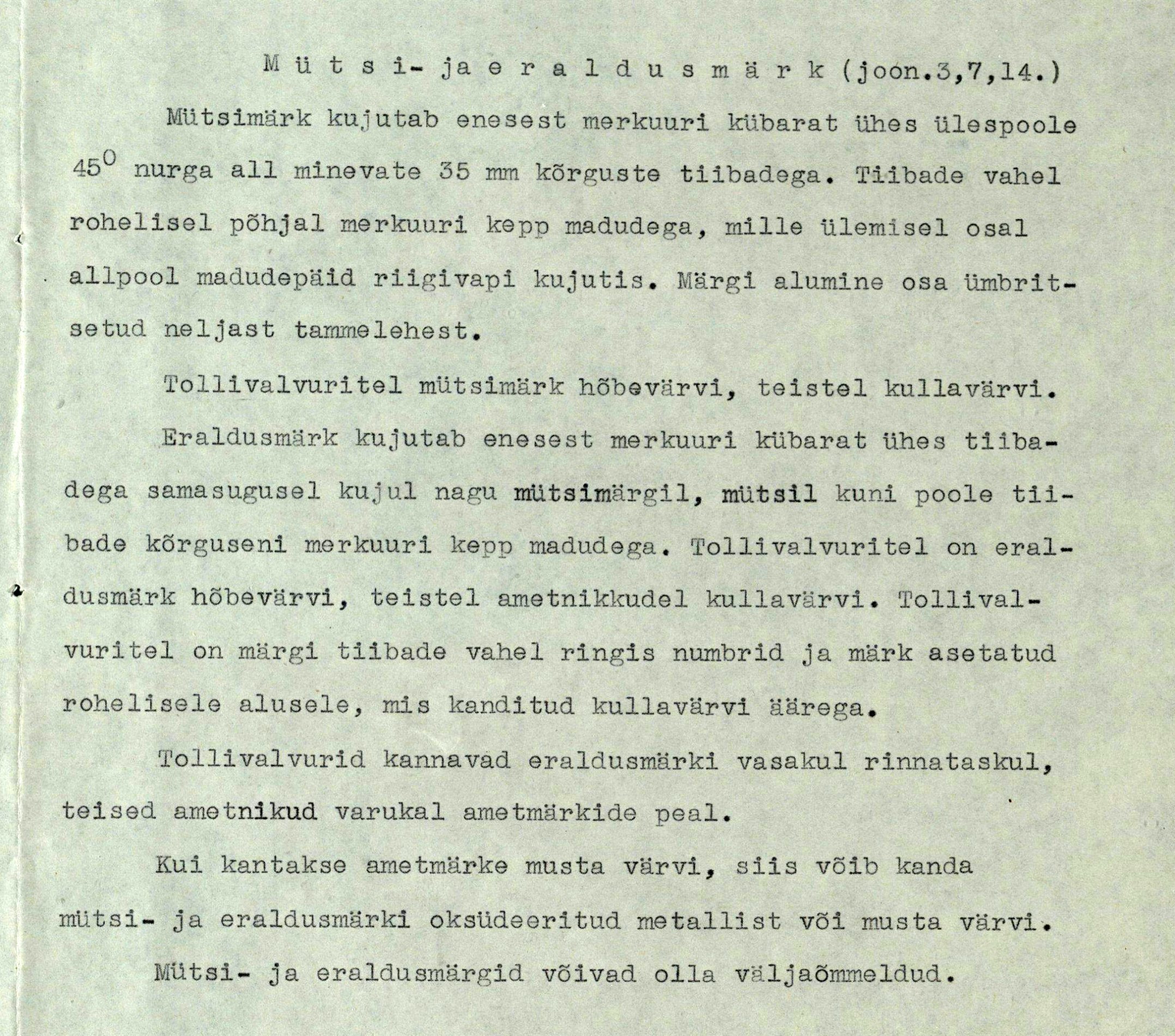 uscha kirjutas: T Jaan 10, 2023 3:03 pm 1936. aasta 14. oktoobril kinnitatud tollitöötaja ametimärki on kahte varianti. Ühel variandil on rohelise ringi sees asuv hõbedane ametimärgi number kinnitatud eraldi detailina (nagu postitatud pildil) ja teisel on see ring seest vaskne ning number tehtud musta värviga. Kas see erinevus olenes ametimehe positsioonist tolliametis või on lihtsalt üks märk varajasem ja teine hilisem? Vaevalt, et Heinrich Kiiveri märgitöökojas lihtsalt niisama paralleelselt kahte erinevat tüüpi märke valmistati?