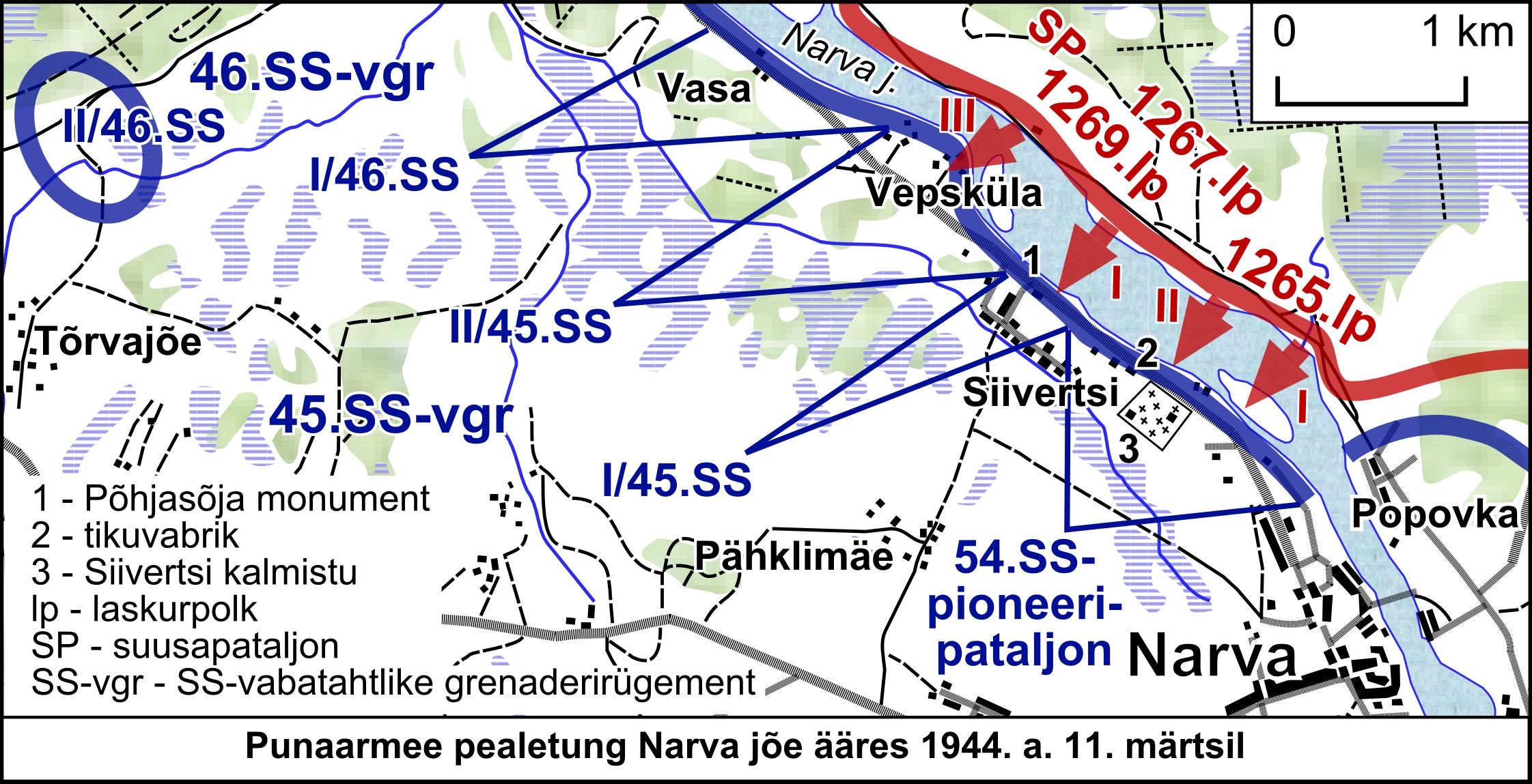 Narva läänekaldal Vasa–Vepsküla–Siivertsi piirkonnas. Sillapea hävitati, kuid suurte kaotuste hinnaga: surnute ja haavatutena langes rivist välja 500– 600 meest. Diviisi kahes rügemendis (45. ja 46. SS-vabatahtlike grenaderirügement) oli kokku neli pataljoni (igas neli kompaniid), neist kolm ehk 45. rügemendi I ja II ning 46. rügemendi II pataljon olid sillapea vallutamisel kandnud põhiraskust ja võitluste lõpuks olid nende read kokku kuivanud. Enne Punaarmee 11. märtsi rünnakut saadi küll lisajõudu 20. eesti diviisi välitagavarapataljonist, kuid tegemist oli valdavalt lahingukogemusteta noorukitega (sündinud 1925. aastal), kes olid mobiliseeritud eelmise aasta sügisel ja sattusid nüüd kohe ägedate lahingute keskele. Pataljonide selline koosseis ei jätnud ilmselt mõju avaldamata nende lahinguväärtusele. 45. ja 46. rügemendis olid ka jalaväekahurite, tankitõrje- ja pioneerikompanii (vastavalt 13., 14. ja 15. kompanii). Pioneerikompaniid olid Vasa–Vepsküla– Siivertsi sillapea likvideerimisel samuti tõsiseid kaotusi taluma pidanud. Diviisi koosseisu kuulusid ka suurtükiväedivisjon ja õhutõrjedivisjon, samuti eraldi tankitõrjerühm, aga ühtlasi side-, sanitaar-, varustusja teised tagalaallüksused. 20. eesti diviisi lahinguallüksuste tugevuse kohta 11. märtsi seisuga täpsemad andmed puuduvad, ligikaudse hinnangu järgi võis pataljonides eesliinivõitlejate arv jääda 300–400 mehe vahele. Peale selle oli diviisile allutatud 660. idapataljonis umbes 300 meest. Diviisi allüksuste käsutuses oli ka 24 7,5 cm ja 5 cm tankitõrjekahurit (1. märtsi seisuga), umbes 10–20 jalaväekahurit ja mõnikümmend 8 cm miinipildujat. Diviisi õhutõrjedivisjoni kolm patareid sisaldasid 8,8 cm, 3,7 cm ja 2 cm õhutõrjekahureid. Järgnevates kaitselahingutes Narva jõe ääres osalesid kindlasti diviisi miinipildujad ja jalaväekahurid, viimaseid kasutati ilmselt peamiselt kaudtuleks. Ei saa ka välistada tankitõrje- või õhutõrjekahurite rakendamist otsesihtimisega positsioonilt, ehkki kinnitust selle kohta allikates napib. Grenaderirügementide pataljonid olid relvastatud peamiselt karabiinidega, kerge- ja raskekuulipildujatega MG 34 ning püstolkuulipildujatega MP 40. Eesti diviisi rindelõik Narva läänekaldal ulatus Narva-Jõesuust (viimane välja arvatud) kuni Siivertsini (osa Siivertsist jäi 20. diviisi vastutusalasse). Diviisile oli allutatud ka Kudruküla piirkonnas Narva jõe ääres kaitsel seisev Kauschi võitlusgrupp, mis