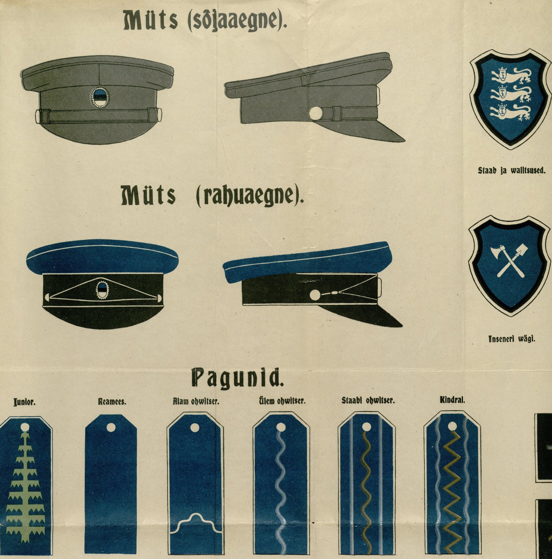 "1919. aasta 23. märtsil kinnitas sõjaminister Konstantin Päts esimese Eesti Rahvaväe vormikirjelduse ühes originaalsete auastme- ja relvaliigitunnustega, mis avaldati sõjavägede ülemjuhataja kindral Laidoneri päevakäsus 22. aprillil 1919.