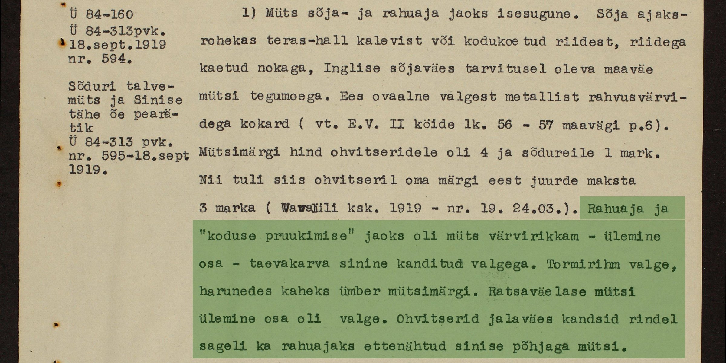 Rahuaegseks kandmiseks mõeldud ohvitseri vormimüts oli rõõmsavärvilisem, see kaunistati Eesti rahvusvärvidega - sinine põhi, must rumm, valged kandid ja ehisnöör. Ratsaväelaste mütsil oli ka põhi valge, ent musta kandiga.".