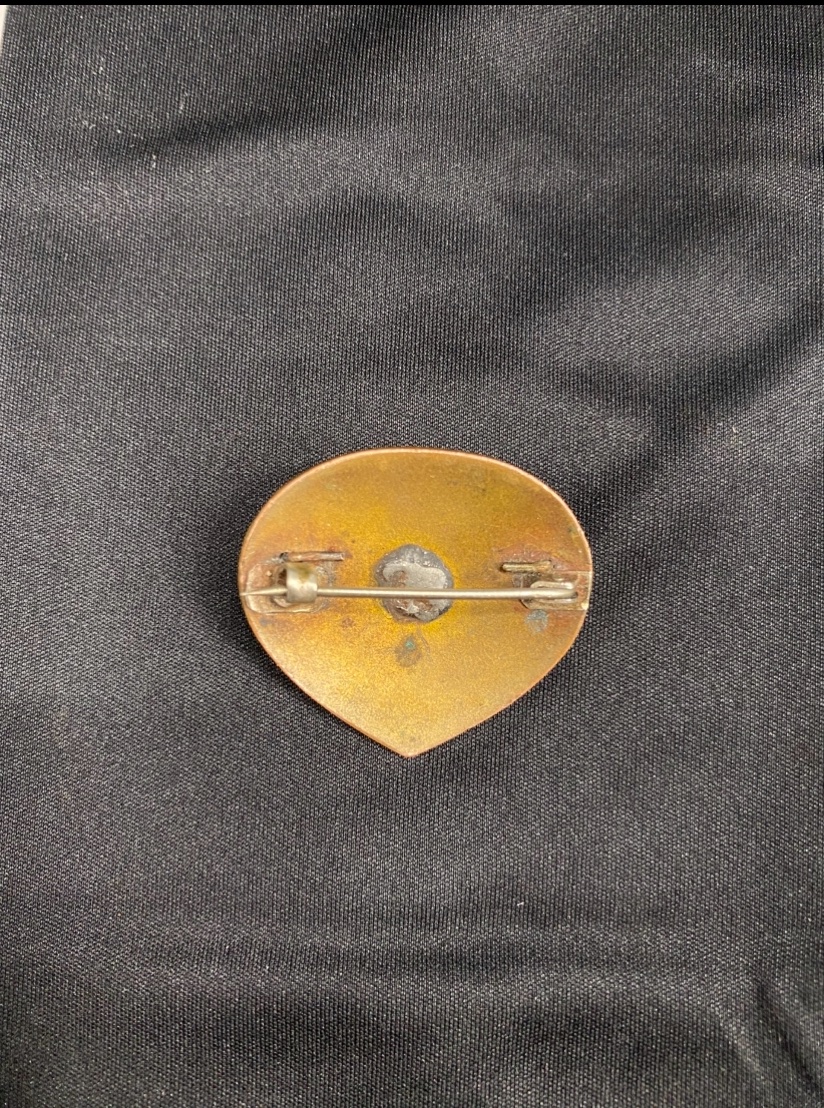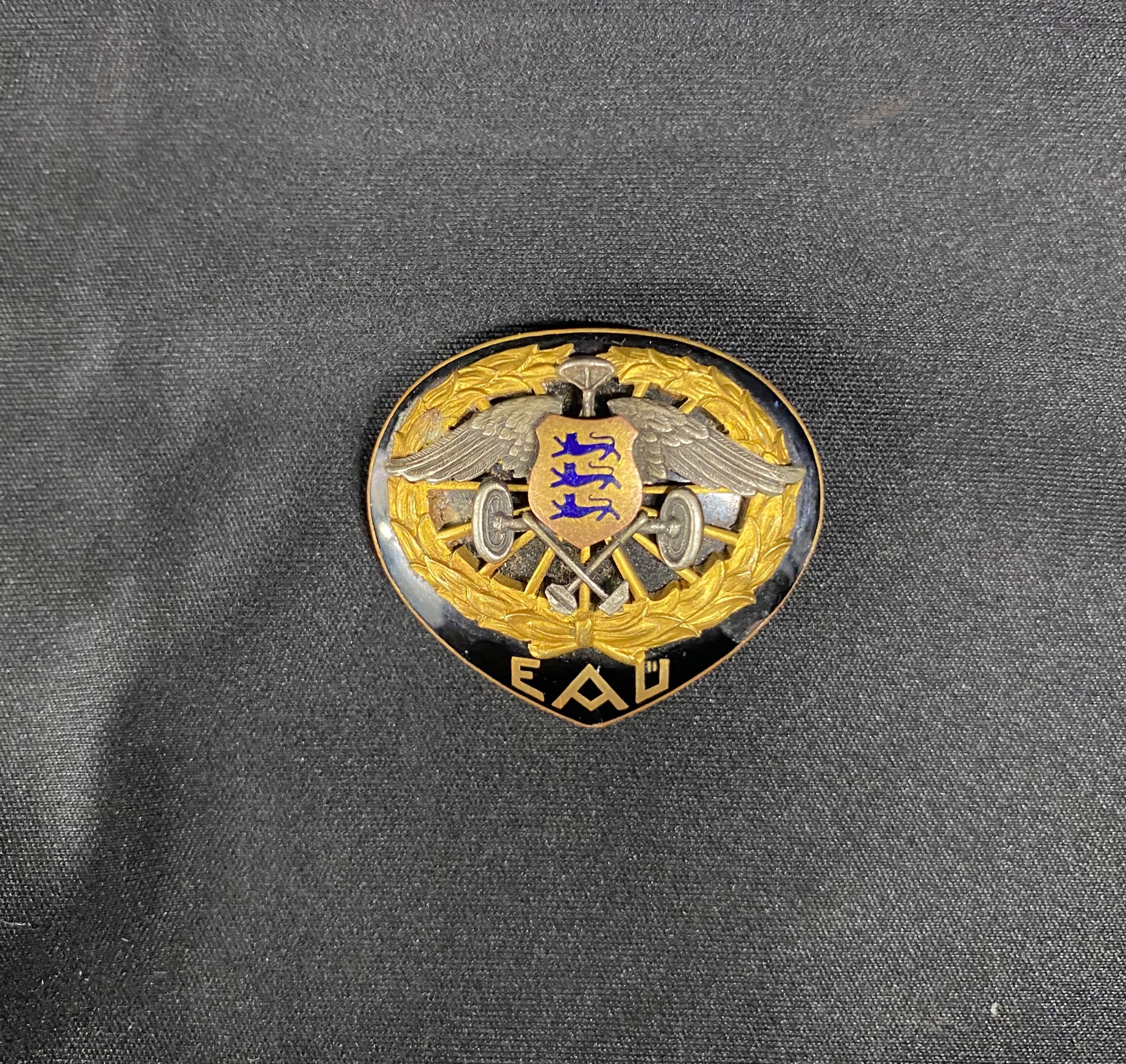 See on EAÜ mütsimärk, millel on klemmid ära tulnud ja see on asendatud nõelkinnitusega.