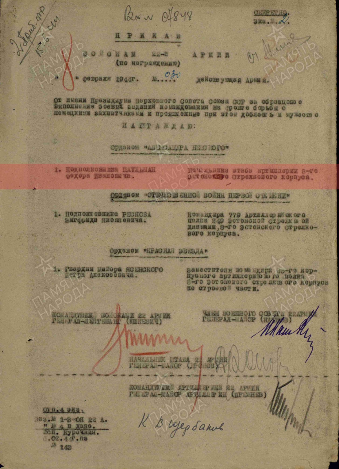Alampolkovnik Paulman F. I. täitis 22. Armee suurtükiväe ülema käsku ja juhtis üldotstarbelist suurtükiväe gruppi 44. laskurkorpuses, kuhu kuulusid 779. suurtükiväepolk, 85. haubitsapolk ja 395. suurtükiväepolk.