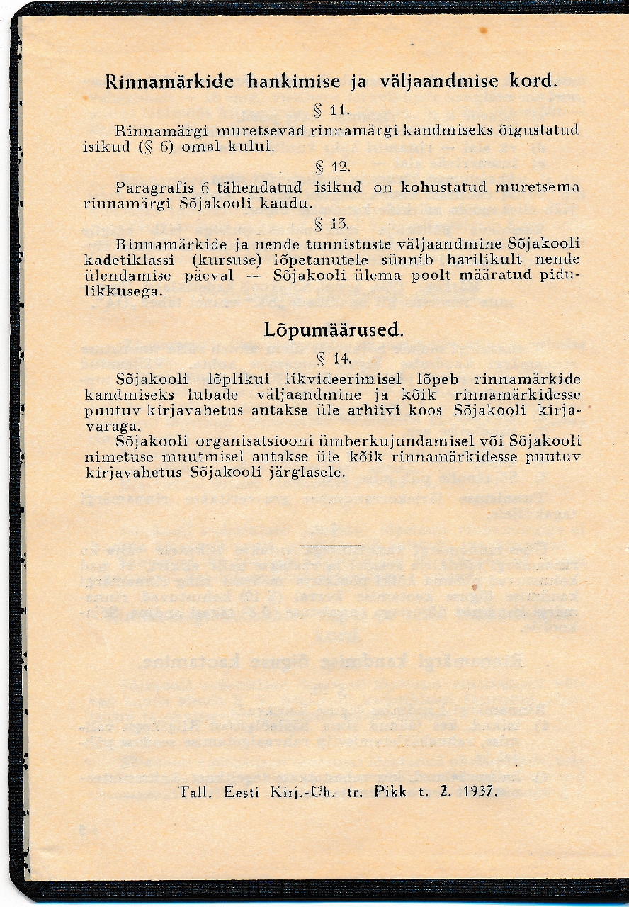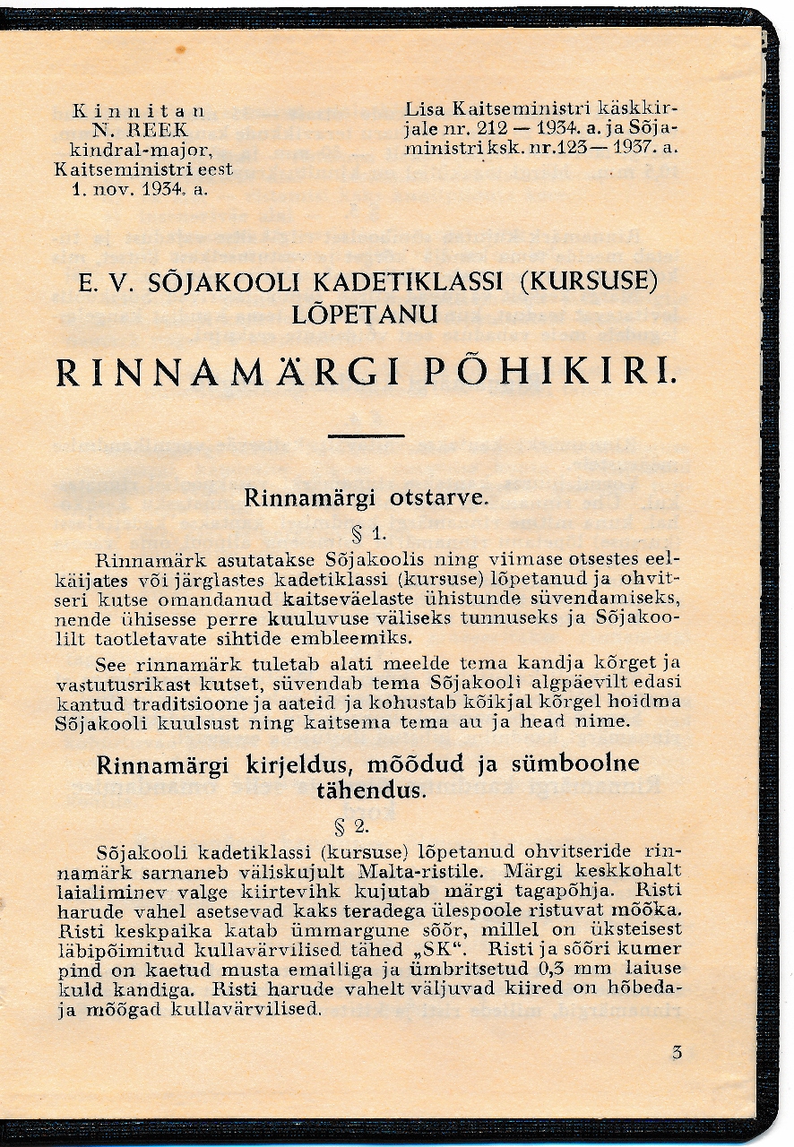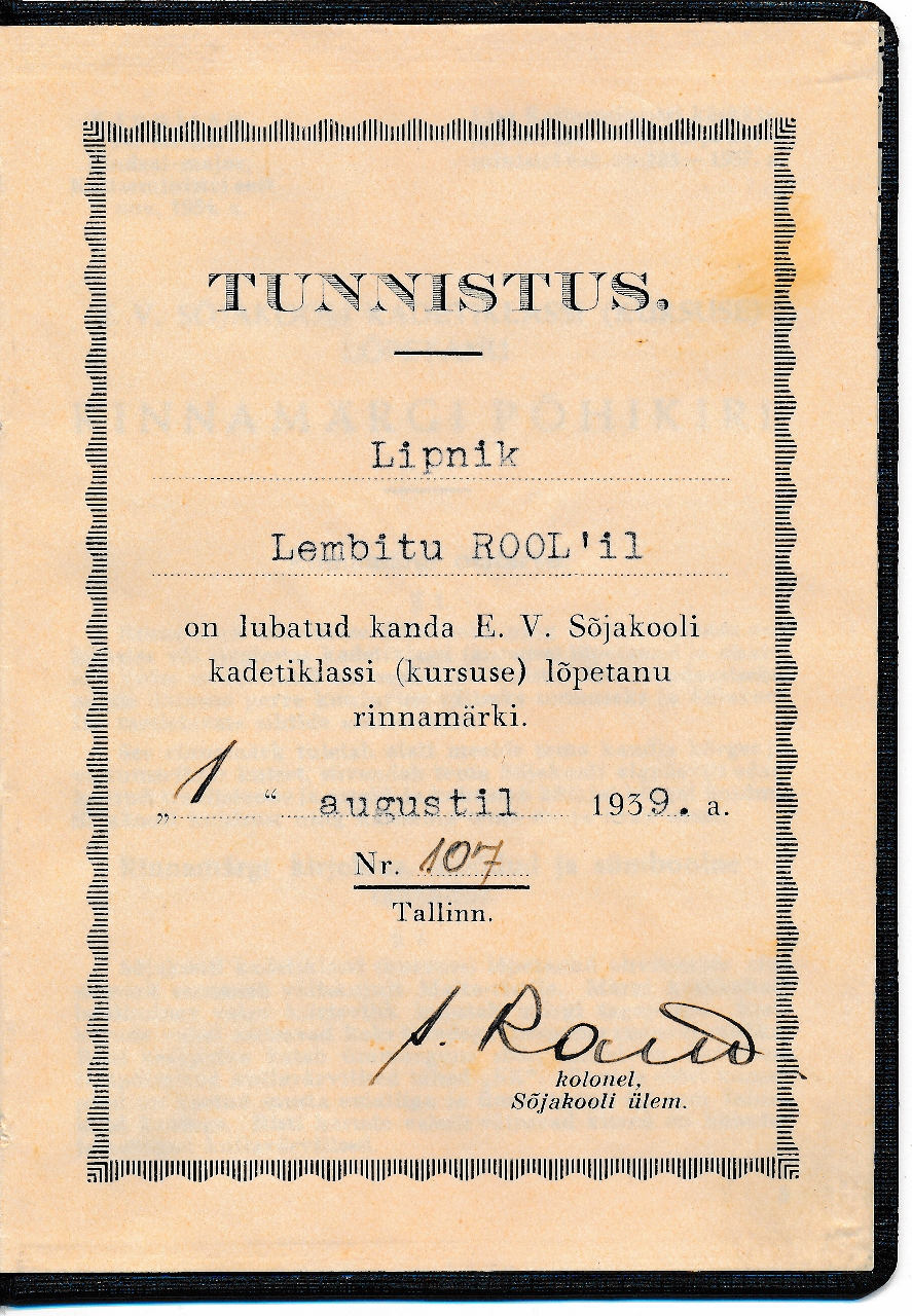Ma ei olnud teadlik, et Sõjakooli lõpumärgiga kaasnes ka rinnamärgi kandmise õigust tõendav tunnistus aga sellised on kaaned Virumaa Muuseumis täitsa olemas. Tunnistus on väljastatud 1939. aastal lipnik Lembitu Rool'ile, kes langes 20. ED ridades 1945. aasta kevadel.