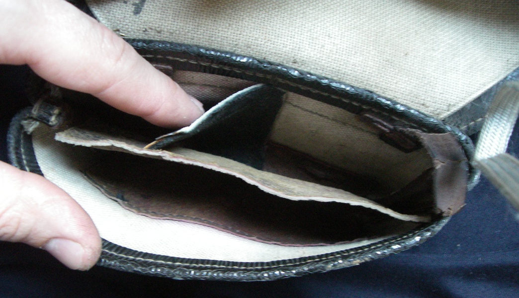 Minu tasku sisu selline. Lohakas töö. Too väike, risti, vahesein oli ühest nurgast vööaasa needi alla jäänud. Ja too suur vahesein mis peaks siis aitama salve paremini kätte saada on põhja külge ühe õmblusega natuke lastud. Tegelikult peab see liikuma ja seest välja tulema kuna teine ots on seina külge õmmeldud. Endal salve pole aga 2 küll sinna ära ei mahuks. Arvan, et lisaks salvele käis seal ka puhastusvahendid/ tööriistad.