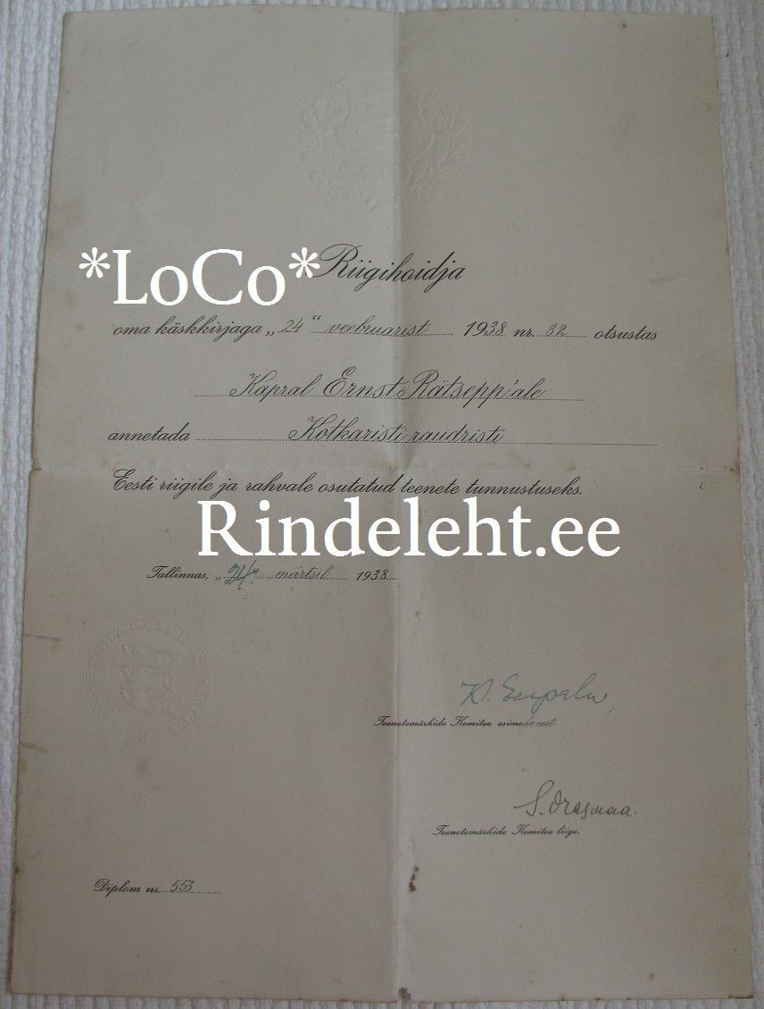 Kotkaristi raudristi tunnistus. Antud 24.02.1938. a kapral Ernst Rätseppale, kes oli Piirivalve Pärnu raj valvur.