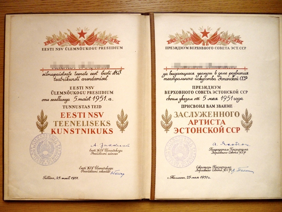Samas õnnestus mul mõned aastad tagasi saada ka eestlasele antud NSVL Rahvakunstniku dokument koos karbi ja medaliga. Aga sellest kunagi hiljem.